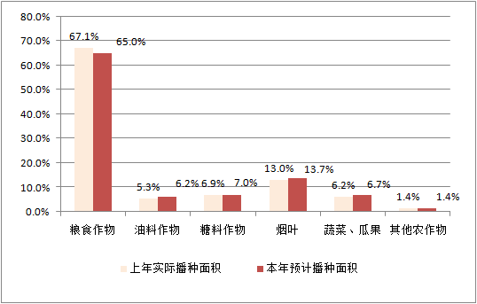 广东省调查户2016年预计播种结构与上年相比基本保持稳定(见图1),略有调整。粮食作物播种面积占比为65.0%,比上年下降2.1%;糖类作物播种面积占比7.0%,比上年上升0.1%;油料作物播种面积占6.2%,比上年上升0.9%;蔬菜瓜果类播种面积占6.7%,比上年上升0.5%;烤烟播种面积占比13.7%,比上年上升0.6%,其他农作物播种面积占比1.4%,比上年上升0.1%,与上年基本持平。总体而言,2016年广东省调查户种植意向的特点是:耕地与播种面积减少,主要是以粮食和糖类作物减少为主,而油料和瓜果类播种面积增加。