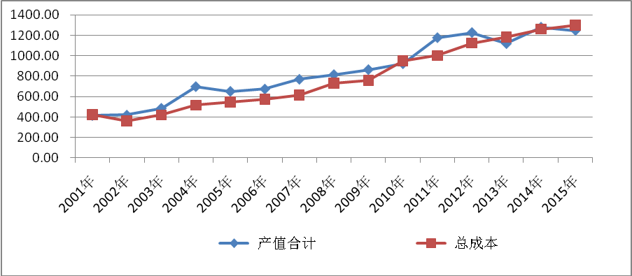 图2:2001-2015年每亩稻谷产值与收益走势图