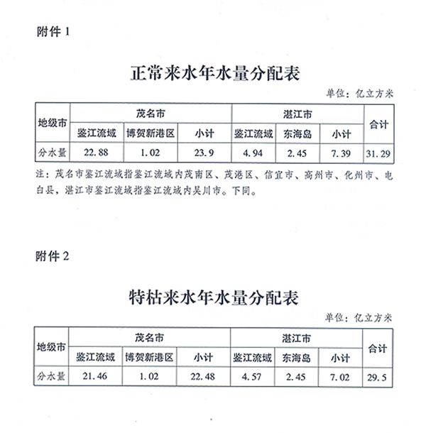 (一)正常来水年和特枯来水年水量分配。综合考虑不同来水年型鉴江流域取用水情况、流域调蓄能力、水资源时空分布特点以及水功能区水质目标,正常来水年鉴江流域可供河道外分配使用的年最大取水量为31.29亿立方米,特枯来水年鉴江流域可供河道外分配使用的年最大取水量为29.50亿立方米。各地区分水量见附件1和附件2。