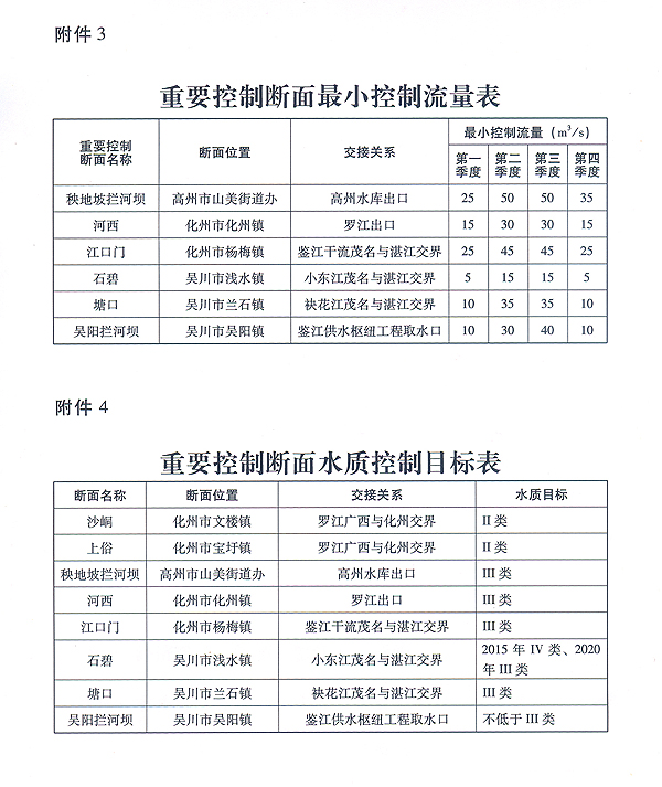 (二)重要控制断面最小下泄流量和水质控制目标。重要控制断面是监控管理水资源分配指标实施情况的节点。重要控制断面水量(最小下泄流量)和水质控制目标是落实鉴江流域水资源分配必须达到的约束性指标,应满足附件3和附件4的要求。