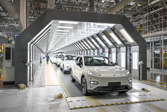 2025年1月9日在位于重庆市渝北区的长安汽车数智工厂总装车间拍摄的即将下线的新能源汽车。新华社记者 王全超 摄