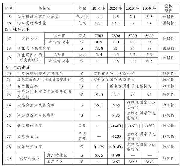 注:1.地区生产总值、人均地区生产总值、海洋生产总值、单位岸线海洋生产总值、单位海域海洋生产总值、常住居民人均可支配收入2020年、2025年和2030年数值按2016年价预计,增长速度为实际增速。