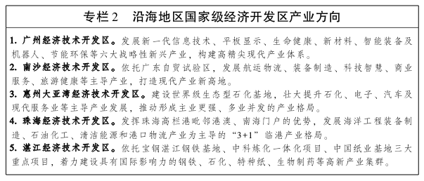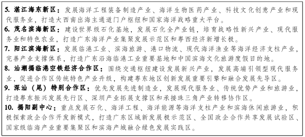 按照主体功能区规划和海洋功能区划的要求,依托沿海经济带产业基础,以重大产业集聚区和重点园区为节点,积极引导产业有序、合理布局,促进产业集聚发展,为实现“一心两极双支点”发展格局提供有力支撑。 珠三角沿海片区重点发展以电子信息、高端装备制造、生物、新材料等为主的高端制造业和总部经济、现代金融、信息经济等现代服务业,着力构建“一区两带”的多层次产业圈,打造世界级高端制造基地和现代服务业中心,增强国际服务枢纽和文化交流门户功能。加快建设以广州、深圳为核心的现代服务业中心区,广州重点发展航运物流、科研与设计、总部经济、金融服务等服务于区域经济的机构和业态,占据现代服务业链条高端,深圳重点发展总部经济、现代金融和信息经济,打造国际信息港。着力增强以广州、深圳为核心的珠江东岸高端电子信息产业带的领先优势,广州重点发展新型显示、集成电路设计等产业,培育发展人工智能产业,推动人工智能与制造业、服务业的广泛融合;深圳重点发展新一代网络、新型显示、集成电路、智能终端等产业,打造全球领先的信息产业集聚区和技术策源地;东莞重点发展智能终端、消费电子和电子元器件,推动信息化与制造业的广泛融合;惠州重点发展消费电子、新型显示等产业,提升产业集聚水平。加快建设以佛山、珠海为龙头的珠江西岸先进装备制造产业带,佛山重点发展智能制造装备、新能源与节能环保装备和新能源汽车,提升家电、家具等传统制造业智能化水平;珠海重点发展临海装备、智能制造装备和高端医疗器械,打造区域性临港重型装备制造业集聚区;中山加快发展海水综合利用装备、高性能船舶和新能源装备,建设临港先进装备制造基地;江门加快建设大广海湾经济区,重点发展智能制造装备、轨道交通装备、汽车和船舶配套等产业。 汕潮揭城市群加快推进区域经济一体化进程,发挥民营经济发达和侨乡优势,大力发展民营经济,吸引华侨投资,提升装备、纺织服装、五金、医药化工、食品、陶瓷、玩具等产业发展水平和集聚度,建设成为海峡西岸重要的经济中心。汕头市加快推进汕头华侨经济文化合作试验区等重大产业平台建设,大力发展港口物流、文化创意、滨海旅游等现代服务业,做大做强装备制造、电子信息、新材料等产业。潮州市重点提升服装、陶瓷、海产品及农产品深加工等传统制造业发展层次和水平,积极发展基因检测设备、电子元器件等新兴产业,着力打造临港产业集聚区。揭阳市加快推进大南海石化工业园、空港经济区、中德金属生态城建设,延伸发展产业链,打造大型石化、空港物流、金属制品产业集群,积极支持装备制造、五金等产业高端化发展,提升产业发展层次。 支持汕尾、阳江两市依托自身区位优势和产业基础,积极把握产业共建窗口期,主动对接珠三角向东西两翼的产业辐射,谋划布局省级产业共建集中集聚区,全力打造珠三角产业拓展主选地和先进生产力延伸区。汕尾继续深化深汕合作机制,加快推进深汕特别合作区建设,积极承接深圳产业转移,重点发展电子信息、高端装备和海洋新兴产业,培育发展大数据、云计算等信息服务业,提升海产品深加工产业水平,加强与台湾海洋产业合作,布局建设汕尾海洋渔业科技产业园,全力打造能源产业基地、滨海旅游目的地和承接珠江东岸产业转移的核心区。