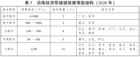 以提升城镇化发展质量为目标,明确沿海城镇空间和规模结构,建立城镇集聚有序、区域中心体系完善、功能协调发展的新型城镇化发展格局。 对接国家“两横三纵”城镇化布局,推进形成“一轴、多中心、集群式”城镇空间结构。“一轴”即依托沿海高速公路、高快速铁路为主的综合运输主通道,构建贯通粤东、珠三角、粤西的沿海发展主轴。“多中心”,即以广州、深圳为主中心,珠海、汕头、湛江为副中心,佛山、惠州、东莞、中山、江门、汕尾、揭阳、潮州、阳江、茂名等为地区性中心,构建“双核多心”功能等级体系,明确各级中心城市的发展定位,提升发展门户枢纽、科技创新、先进制造等核心功能,增强其对周边中小城市和小城镇的辐射带动能力。“集群式”,即构筑珠三角世界级湾区城市群、汕潮揭城市群和湛茂阳城市带等城镇组合形态,以城市群为主体形态促进珠三角国际化水平大幅提升,推动环珠三角城市与珠三角城市融合发展,带动粤东和粤西沿海地区加快发展。积极培育广州-深圳(珠海)、汕头-潮州-揭阳、海安-廉江等纵深发展的城镇拓展轴,进一步优化城镇发展结构。 科学促进人口和产业向沿海地区协同集聚和合理分布。调控珠三角地区人口规模和分布,广州、深圳等超大城市要进一步加强人口调控和服务管理,根据城市综合承载能力和功能定位,引导人口在主城区、郊区、新区等区域合理分布。培育若干城区人口超100万的中心城市,重点建设人口在50万人以下的小城市以及5―10万人以上的小城镇,成为吸纳农业转移人口的重要载体。