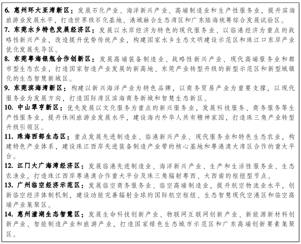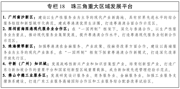 把沿海经济带作为粤港澳大湾区的重要拓展区域。深化粤港澳合作,推进粤港澳大湾区建设,形成充满活力的世界级经济区、具有全球影响力的国际科技创新中心、重要的国际开放枢纽门户、内地与港澳深度合作示范区和宜居宜业宜游的优质生活圈,打造富有活力和国际竞争力的一流湾区和世界级城市群。推进基础设施互联互通,强化珠三角与港澳交通联系,构建高效便捷的现代综合交通运输体系。提升市场一体化水平,落实CEPA及其系列协议,促进要素便捷流动,提高通关便利化水平,打造具有全球竞争力的营商环境。打造国际科技创新中心,统筹利用全球科技创新资源,完善创新合作体制机制,优化跨区域合作创新发展模式,构建国际化、开放型区域创新共同体。推进产业协同发展,将广东的制造业优势与港澳的国际化优势充分结合,一起迈向国际分工体系高端。共建宜居宜业宜游的优质生活圈,提高社会管理和公共服务能力和水平,打造国际化教育和人才高地,完善就业创业服务体系,推进区域旅游发展,建设健康绿色低碳湾区。共同培育国际合作新优势,深化与“一带一路”沿线国家在基础设施互联互通、经贸等领域的合作,携手打造推进“一带一路”建设的重要支撑区。推进深圳前海、广州南沙、珠海横琴等重大粤港澳合作平台开发建设,支持落马洲河套港深创新及科技园、江门大广海湾经济区、中山粤澳全面合作示范区、东莞滨海湾地区、佛山南海粤港澳合作高端服务示范区和惠州潼湖生态智慧区等合作平台建设。