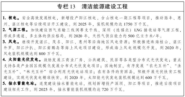 推进沿海核电、海上风电和天然气接收储运设施建设,加大油气等海洋能源资源勘探开发,延伸能源上下游产业链,发展壮大能源装备产业,建设沿海电力、可再生能源、储运中转、油气资源开发和能源装备产业等五大现代能源产业基地,形成珠三角优化发展、东西两翼规模化发展、阳江和汕尾骨干能源基地集聚发展的沿海清洁能源产业带。 安全高效发展沿海核电,建成阳江核电、台山核电一期工程,推动陆丰、惠州、湛江核电等后续项目开工,到2020年沿海核电装机规模约达1600万千瓦。优化发展超低排放煤电,优化煤电布局,结合用电需求增长情况推进汕尾、湛江等东西两翼沿海地区在建煤电项目建设,珠三角地区禁止新建、扩建煤电机组和企业自备电厂。根据沿海城市发展需要和功能区划调整,推进城市燃煤电厂退役替代及搬迁异地建设,有序实施推进东莞沙角电厂、汕头电厂、湛江电厂等城市煤电厂退役、替代及搬迁,将珠三角关停燃煤电厂容量转移到阳江、汕尾和东西两翼其他地区建设大型骨干电源,腾出土地资源用于珠三角地区产业转型升级。有序发展气电,合理布局建设天然气调峰电源、热电联产和分布式能源站项目。合理推进抽水蓄能电站建设,建成投产深圳抽水蓄能电站,继续推进阳江抽水蓄能电站建设,推进江门(新会)等后续抽水蓄能电站项目前期工作。进一步发挥汕尾、阳江作为珠三角辐射粤东粤西的战略支点作用,有序推进核电、煤电、海上风电等骨干电源建设,打造汕尾、阳江骨干电力基地。到2020年,沿海地区电力供应能力达8200万千瓦。加强东西两翼沿海地区向珠三角跨区送电通道建设,实施沙角至广南线路解口入狮洋等工程,提高沿海电网智能化水平和抗风险能力。 陆海并举,积极有序发展风电,促进风电技术进步和产业升级,实现风电全产业链发展。适度开发风能资源丰富的粤东、粤西沿海地区陆上风电,规划开工建设陆上风电项目31个,总装机容量160万千瓦,推进湛江雷州井仔、徐闻学田、阳江阳东宝山、惠州惠东桃园等风电项目;规模化、集约化开发海上风电资源,加快珠海、汕头、阳江、湛江等近海风电场开发建设,重点推进珠海桂山、阳江南鹏岛、阳江沙扒、湛江外罗等海上风电项目,探索开展深远海海上风电项目建设。到2020年,风电装机规模达到800万千瓦。大力推广利用太阳能,推进建设分布式光伏发电系统,鼓励各类投资主体建设分布式光伏发电系统,重点推进广州、深圳、珠海、佛山、惠州、东莞等地各类工(产)业园区、大型公共建筑物等分布式光伏发电项目建设;支持建设与农业、林业、渔业相结合的地面光伏电站,重点在湛江、阳江、茂名、惠州、汕尾等地发展“农光互补”“渔光互补”等综合利用光伏电站项目;积极推进做好光伏扶贫工作。到2020年,太阳能光伏发电装机规模达到600万千瓦。