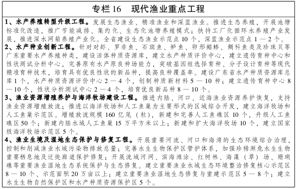 优化沿海经济带农业和渔业产业结构,发展农业和渔业新业态,提高综合效益和竞争力,推动农业和渔业现代化发展。 切实保护耕地资源,大力推进高标准农田建设,确保至2020年沿海地区高标准农田建设基本完成。严格控制近海捕捞强度,实行近海捕捞产量负增长政策,严格执行伏季休渔制度和捕捞业准入制度,积极推进渔业减船转产。保护近岸海洋生物资源,大力推进海洋牧场建设。建设以人工鱼礁为载体,增殖放流、底播增殖为手段的海洋牧场示范区。科学养护海水养殖区和传统渔场海洋生物资源,合理控制增养殖密度和规模,改善近岸养殖用海生态环境,提升资源增殖效果和海岸生态修复效果。重点建设惠州稔平半岛、江门镇海湾、黄茅海―磨刀门、汕头南澳―饶平、汕尾、阳江海陵湾、湛江雷州半岛东部和西部、茂名博贺等近岸海洋增养殖基地。 按照珠三角都市农业区、潮汕平原精细农业区、粤西热带农业区、南亚热带农业带的沿海农业发展格局进行优化布局。珠三角都市农业区主要发展高效园艺及水产加工、生物育种研发、现代化农产品物流、观光休闲农业等都市精品农业;潮汕平原精细农业区重点建设一批具有地方特色和市场优势的加工型蔬菜、茶叶、优稀水果、花卉、水稻、畜禽等精致高效农业;粤西热带农业区重点建设雷州半岛热带亚热带农业现代化示范区、冬季北运菜重要生产基地、热带水果示范区、国家种业二线南繁基地等节水高效农业;南亚热带农业带重点建设全省现代粮食及畜禽产品供给保障基地,发展岭南水果、淡水养殖、南药等优势产品的生产加工,发展草食畜牧业。主要建设台山、廉江、雷州、电白、开平、遂溪、吴川、海丰、惠东、陆丰、新会、恩平、阳东、阳西、饶平、潮阳、潮南、揭东等18个产量超10万吨的优质稻米生产大县,电白、廉江、遂溪、开平等4个年出栏超50万头的生猪大县,澄海、徐闻、南海、揭东、遂溪、廉江、惠东、阳西、雷州、电白等10个国家蔬菜大县,24个水果大县(包括1个产量超3万吨的柑橘大县廉江,电白、廉江、阳东、阳西、东莞、惠阳、惠东、惠来、陆丰、海丰等10个产量超1万吨的荔枝大县,徐闻、雷州、廉江、遂溪、坡头、电白、南沙、潮阳、吴川、东莞、中山、恩平、榕城等13个产量超3万吨的香蕉大县),以及潮安、饶平、湘桥、惠来、廉江等5个种植面积超过1.5万亩或产量超1千吨茶叶大县。 推进科学养殖,构建以品种为单位,涵盖基础研究、新品种培育、苗种扩繁和市场化推广及种质测试评估、公共服务平台建设等全产业链的现代种业体系。推广绿色生态养殖模式,以市场需求为导向,运用生态技术措施改善养殖水质和生态环境。发展深蓝渔业,推进深水网箱产业化基地和园区建设,开发海洋牧场,把发展深水网箱养殖作为调整优化粤东、粤西渔业产业结构的战略重点。充分发挥粤东、粤西的沿海区位优势和渔业资源优势,发展集约化高效清洁养殖,支持深水抗风浪网箱养殖和工厂化循环水养殖,推动深水网箱养殖的产业化、集群化。打造粤东名优海水鱼类、名贵经济贝类和海藻养殖基地及粤西对虾、湛江南珠海水养殖、罗非鱼生产、热带特色贝类养殖基地。发展远洋渔业,推动捕捞作业重点从近海转向深远海,延长产业链。做大做强精深加工业,发展水产品精深加工和综合利用,培育扶持具有国际竞争力的水产加工龙头企业。建设水产品仓储、运输等冷链物流,发展水产品交易市场。建设水产品质量检测中心,创建出口水产品质量安全示范区。珠三角都市渔业区以提质增效为主线,重点发展生态高效集约化池塘养殖、设施养殖和外向型渔业,扶持具有鲜明地方特色品种的中山脆肉鲩、珠海海鲈、江门锦鲤、江门牡蛎、东莞龟鳖等品牌产品发展。在城市周边地区建设休闲渔业区,形成具有都市特色,集约化养殖、休闲渔业和外向型渔业为一体的现代都市型渔业模式。引导珠三角地区以都市现代观光渔业为主体,东西两翼以地方特色渔业文化和民俗文化特色资源为载体,打造休闲渔业精品品牌,创建一批最美渔村和全国精品休闲渔业示范基地。 加强渔政渔港等基础设施建设,推动渔港经济区和渔区城镇融合发展。构建以区域性避风锚地、示范性(一级)渔港为核心,以二、三级渔港为基础的现代渔港新体系,形成“一轴、三区、多群”的空间布局。以三百门、云澳、海门、神泉、莲花山、沙堤、闸坡、博贺、硇洲、乌石十大示范性(一级)渔港为节点构建全省现代渔港主轴。建设粤东、珠三角、粤西三大渔港湾区。粤东渔港湾区主要包括汕头、汕尾、潮州和揭阳4个沿海市,适当增加示范性(一级)渔港、二级渔港、三级渔港布局,重点建设2座区域性避风锚地、4座示范性(一级)渔港、10座二级渔港、6座三级渔港。珠三角渔港湾区主要包括广州、深圳、珠海、惠州、东莞、中山和江门7个沿海市,突出兼顾大中小型渔港,着力增加二、三级渔港布局,重点建设1座区域性避风锚地、2座示范性(一级)渔港、8座二级渔港、8座三级渔港。粤西渔港湾区主要包括阳江、茂名和湛江3个沿海市,加大区域性避风锚地、示范性(一级)渔港建设,同时,加大二、三级性渔港布局密度,加强渔港避风能力、强化渔港综合服务功能,重点建设3座区域性避风锚地、4座示范性(一级)渔港、15座二级渔港、15座三