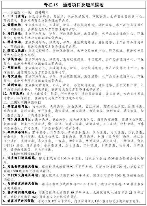 一、编制实施专项规划 以沿海经济带发展的关键领域为对象编制《广东省海岸带综合保护和利用规划》《广东省沿海经济带滨海旅游发展行动计划》《广东省滨海旅游公路规划》等若干专项规划、计划。各专项规划要深化和细化编制内容,量化目标,明确任务,突出重点,强化可操作性。各地区、各部门根据实际需要,适时编制沿海经济社会发展相关专项规划和地方相关规划。 研究谋划一批重大工程项目,注重优化投资结构,提高重大产业和基础保障项目投资比重;注重优化区域布局,推动重大项目向粤东粤西沿海地区倾斜。谋划实施包括交通、能源、水利、科技创新、产业、农渔业、旅游、生态等八大工程包,共计480个项目,总投资3.5万亿元。加强重大项目储备,有序推进重大项目建设。