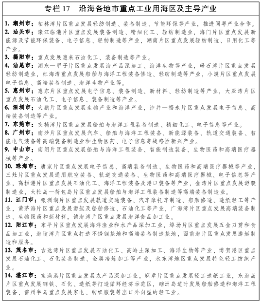 依托沿海经济带制造业基础优势,立足海洋特色资源和海洋开发需求,积极培育发展海洋新兴产业和先进制造业,大力提高临海、临港制造业整体竞争力,着力打造具有国际竞争力的临海高端制造产业集群。 大力发展海洋药物和生物制品,实施海洋生物医药技术重点突破计划,积极开展海洋生物活性物质筛选、重要海洋动植物和微生物基因组及功能基因工程,大力开发新型海洋蛋白、多糖、多肽类创新药物和海洋生物基因工程制品,积极开发海洋功能食品、化妆品和海洋生物材料。加快建设广州、湛江国家海洋高技术产业基地和深圳海洋生物产业基地,大力推动海洋生物重大新品种的培育、扩繁与产业化,支持汕头、阳江等地发展海洋生物产业。加快海水综合利用产业发展,重点发展海水淡化、直接利用和综合利用的关键材料、技术和设备,在阳江、汕尾等地建设海水淡化和综合利用示范工程,依托炼化、钢铁、造纸等高耗水企业,大力推广海水直接利用。围绕“智慧海洋”建设,大力发展海洋电子信息产业,支持大型电子信息产业向海洋领域拓展,重点发展船载智能终端、船用导航雷达、海洋自动监测系统等高端海洋电子设备及系统,提升船用电子设备和海洋工程装备电子设备的研发制造水平。依托南海资源勘探开发,在广州、深圳规划建设深海研究基地,发展海洋遥感与导航、水声探测、深海传感器、无人和载人深潜、海底通信定位等关键技术和设备,开展海洋资源利用关键技术研发和产业化应用。 加快海洋船舶产品结构优化升级,以散货船、油船、集装箱船等三大主流船型为重点,提高海洋船舶研发设计能力,加快发展液化天然气船、海洋工程辅助用船、多功能海洋工程船、海上风电安装船、豪华邮轮等高技术高附加值船舶和智能航行系统、船用柴油机、电力推进系统等关键部件,推进军民船舶装备科研生产融合发展和成果共享,建设广州、中山船舶制造基地、江门中小型船舶及配套设备基地和珠海游艇产业研发制造基地。面向深远海资源开发,培育发展海洋工程装备总包和设计能力,重点突破浮式生产储卸装置、浮式液化天然气储存和再气化装置、超深水钻井平台等主力海洋工程装备研发设计和制造技术,形成总装建造能力,培育发展系泊定位系统、发电机组、专用作业包等海洋工程装备专用系统,鼓励发展智能码头和新一代港口机械。推进广州龙穴、珠海高栏港、深圳蛇口海洋工程装备制造基地建设,适时在阳江、汕尾布局建设海洋工程装备基地。积极发展海洋专用设备,重点开发深海环境监测、深水探测、海洋卫星遥感、水下作业装备等产品,支持广州建设国家海洋专用设备检测中心。培育发展海洋精细化工,重点发展依托海洋资源的氯碱、纯碱、溴素及深加工等产业链,积极开发海洋防腐涂料、海洋无机功能材料、海洋高分子材料等产品和海藻化工新产品,支持湛江、茂名、揭阳等地建设海洋精细化工基地。 依托港口资源优势,加快建设惠州、湛江、茂名、揭阳四大炼化一体化基地,适度提高炼油、乙烯生产能力,提升油品质量和标准,重点发展对二甲苯、环氧乙烷等有机化工原料,延伸发展高端聚烯烃塑料、高端工程塑料、高性能特种橡胶,提高化工新材料整体自给率,加快精细化工的绿色工艺和产品开发,大力发展高纯电子化学品、高端表面活性剂、高端加工助剂等精细化工产品,提升高附加值、高技术、低污染的精细化工产品在石化产业中的比重,打造各具特色的精细化工产业链。进一步优化石化产业布局,推动广州石化搬迁,提升珠海高栏港、江门银洲湖等精细化工基地发展水平。支持湛江钢铁基地优化发展,巩固提升超高强汽车用钢、建筑用钢、高性能不锈钢、高性能硅钢等精品钢材的技术水平和市场能力,支持阳江高新区高端不锈钢产业基地建设,在粤东粤西地区适时布局建设综合性钢铁资源回收利用基地。以绿色环保为前提推动造纸工业精品化发展,重点建设江门银洲湖、湛江麻章和东海岛、阳江高新区等精品纸业基地。
