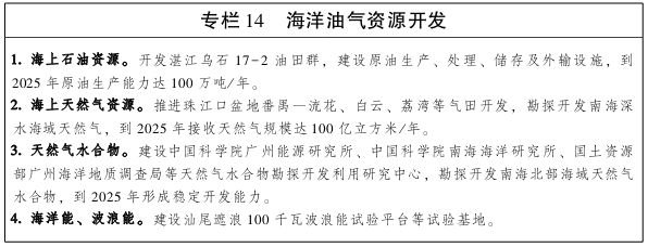 三、建设沿海油气等能源储运和中转基地 合理建设天然气接收站和应急调峰储气设施、原油储备库、煤炭中转储备设施,形成粤东、粤西、珠三角能源接收和储运基地。加快推进中石油深圳调峰站(迭福北)LNG等气源工程建设,推动粤西、阳江、广州南沙、潮州、汕头、惠州等天然气接收及储备项目前期工作,到2020年沿海地区天然气供应能力约500亿立方米/年。建设惠州、湛江、揭阳原油储备库,发展沿海成品油商业储备。推进沿海油气输送网络建设,到2020年形成通达沿海经济带各地级以上市的一体化天然气主干管网,以及连接各大炼化基地、主要消费城市、成品油储备基地的成品油输送干线。加强煤炭储运设施建设,建设广州港、珠海高栏港等国家煤炭储备基地和粤东、粤西大型煤炭中转储备基地,形成与国内外煤运战略大通道相连接,辐射周边省份的煤炭中转储运交易中心。 加快建设国家海上油气战略接续区,加强南海北部海上石油基地开发,积极稳妥推进南海深水石油勘探开发,建设湛江市雷州乌石17-2油田群开发项目。加大珠江口盆地番禺―流花、白云、荔湾凹陷海上常规天然气勘探开发力度,继续扩大珠海高栏港、横琴岛等海上天然气接收基地天然气接收规模,加强相关配套管网建设,在广州、深圳布局建设海洋油气资源勘探开发和加工储备基地。全力推进可燃冰试采和商业化开发,加强省部合作开发可燃冰项目,规划建设南沙可燃冰项目码头和基地,加快推进可燃冰产业化进程。积极推进海洋能、波浪能等开发利用,加快资源普查和实验性基地建设。