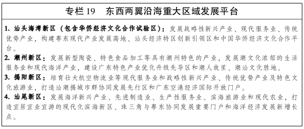 承接珠三角世界级湾区城市群辐射带动作用,以都市区为主体聚合区域核心功能,培育沿海重要节点城市,打造东西两翼沿海经济增长极,加快推进沿海经济带一体化进程。 打造东翼沿海增长极。以汕头为中心,加快推进汕潮揭同城化发展,建设资源共享、一体化融合发展的汕潮揭特色城市群。加快潮惠、揭惠、汕湛高速汕头段及潮汕环线等高速公路建设,推进广梅汕铁路二线、厦深高铁联络线、汕头港疏港铁路建设,规划建设粤东城际轨道,形成汕潮揭“一小时生活圈”。围绕汕头港、高铁潮汕站、揭阳潮汕机场三大交通枢纽,建设汕潮揭临港空铁经济合作区,着力发展临海能源、临海现代工业、海洋交通运输、滨海旅游、水产品精深加工等产业。加快揭阳副中心建设,打造广东区域新发展极示范区。推动粤东各市加快对接和融入海峡西岸经济区发展,加快推进汕头至漳州铁路、鹰梅汕铁路、宁莞高速等项目建设,连通江西、福建发展腹地,携手福建共同建设海西经济圈和“21世纪海上丝绸之路”支点。 培育汕尾作为珠三角地区连接粤东地区的战略支点。依托深汕特别合作区,推进汕尾主动对接融入深莞惠经济圈,打造珠江东岸产业转移主承接区。推进出省通道、连接珠三角路网及市域交通网络建设,推进汕尾港建设,整合汕尾新港区、海丰港区和陆丰港区,开辟东南沿海新的出海航道,打造区域性现代物流中心。建设粤东地区通向珠三角的桥头堡、滨海旅游聚集地、宜居宜业宜游的现代化滨海城市、省电子信息产业基地。