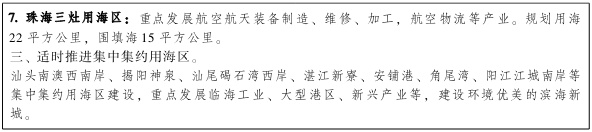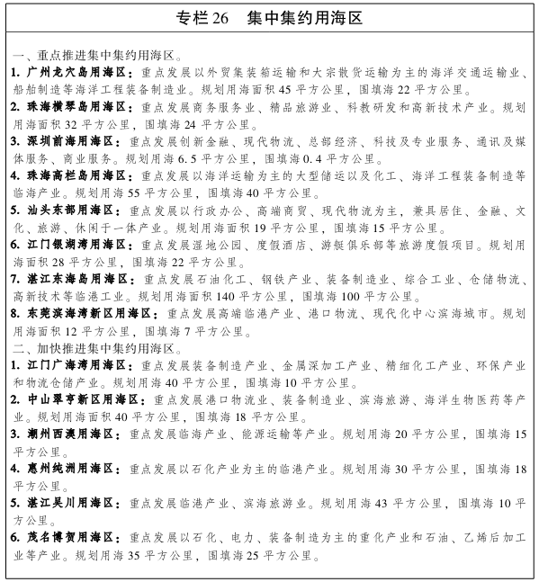 坚持陆海统筹、科学适度用海和维护海洋生态环境原则,积极推进建设重点突出、特色鲜明、功能明晰、优势互补的集中集约用海区域,优化用海布局,引导海洋产业集聚发展。 优化用海布局,推进建设集中集约用海区域,实行集中连片适度规模开发,适度提高用海项目准入门槛,提高单位海域和岸线的投资强度和产出效益,推动传统的粗放低效用海方式向集约高效转变。重点打造广州龙穴岛、深圳前海、珠海横琴岛、珠海高栏岛、汕头东部、江门银湖湾、湛江东海岛、东莞滨海湾新区等8个集中集约用海区,规划用海面积3375平方公里,围填海面积2304平方公里。加快推进江门广海湾、中山翠亨新区、潮州西澳、惠州纯洲、湛江吴川、茂名博贺、珠海三灶等7个集中集约用海区建设,规划用海面积230平方公里,围填海面积111平方公里。适时推进汕头南澳西南岸、揭阳神泉、汕尾碣石湾西岸、湛江新寮、湛江安铺港、湛江角尾湾、阳江江城南岸等集中集约用海区建设。