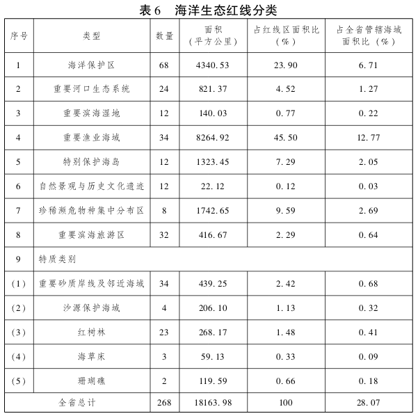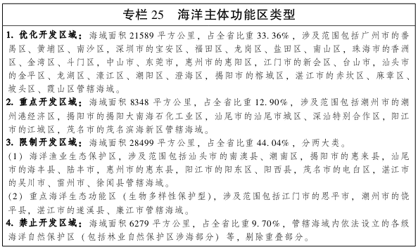 (二)海洋主体功能区。划分为优化开发区域、重点开发区域、限制开发区域、禁止开发区域四类区域。优化开发区域是指现有开发利用强度较高,资源环境约束较强,产业结构亟需调整和优化的海域,面积21589平方公里,占全省的33.36%,东起惠州市惠阳区管辖海域,西至江门台山市管辖海域,以及汕头、湛江、揭阳市的中心城区管辖海域,包括中山、东莞及广州3个区、深圳5个区、珠海3个区、惠州1个区、江门1个区和1个县级市、汕头5个区、揭阳1个区、湛江4个区的管辖海域,在保证生态安全的前提下,适度安排围填海指标满足高端产业发展要求,加快转变海洋经济发展模式,整合优化传统海洋产业、港口资源,着力发展海洋战略性新兴产业、高端旅游产业。重点开发区域是指在沿海经济社会发展中具有重要地位,发展潜力较大,资源环境承载能力较强,可以进行高强度集中开发的海域,面积8348平方公里,占全省的12.90%,主要分布在粤东粤西海域,汕尾1个区和1个县、潮州1个县、揭阳1个县、阳江1个区、茂名2个区的管辖海域,可以适当扩大围填海计划指标,满足港口及临港工业、物流、旅游等重点产业发展要求,促进沿海城镇与海洋协调发展,着力推进现代海洋产业体系和港口体系建设,加快滨海旅游业、海洋渔业发展。限制开发区域是指以提供海洋水产品为主要功能的海域,包括用于保护海洋渔业资源和海洋生态功能的海域,面积28499平方公里,占全省的44.04%,主要分布在粤东粤西海域,包括汕头1个区和1个县、揭阳1个县、汕尾1个县和1个县级市、惠州1个县、阳江1个区和1个县、茂名1个区、湛江2个县和3个县级市、江门1个县级市、潮州1个县的管辖海域,要加强海洋生态环境保护,严格控制开发强度和围填海规模,因地制宜推进产业点状集聚发展,合理推进滨海旅游发展。禁止开发区域是指对维护海洋生物多样性,保护典型海洋生态系统具有重要作用的海域,包括海洋自然保护区、领海基点所在岛屿等,扣除重复面积后为6279平方公里,占全省的9.70%,依法对各类自然保护区实行强制性保护,对领海基点所在岛屿实行全岛保护。