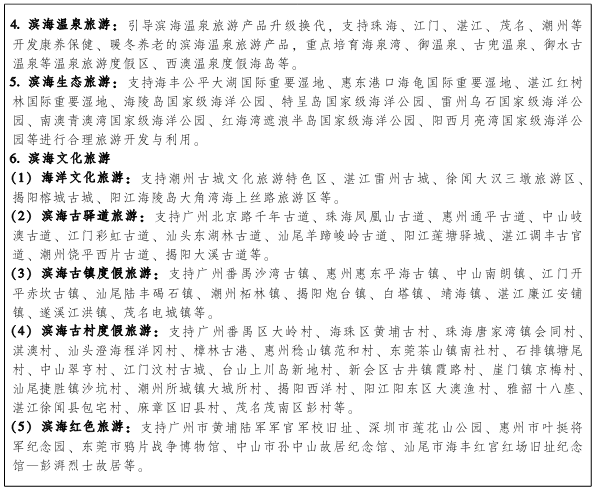 三、打造滨海旅游带 依托滨海旅游公路、区域市场和旅游产业三大优势,整合我省滨海旅游资源。利用旅游公路及其交通枢纽衔接网络,串联潮州市绿岛旅游山庄、揭阳市金海湾旅游区、汕头市南澳生态旅游区、汕尾市红海湾旅游区、惠州市海滨温泉旅游度假区、深圳市华侨城旅游度假区、东莞市鸦片战争博物馆、广州市南沙滨海湿地景区、中山市孙中山故居、江门市川岛旅游度假区、阳江市海陵岛大角湾风景名胜区、茂名市放鸡岛海上游乐世界、湛江市湖光岩风景名胜区等旅游景区,建设粤东沿海风景道、环珠江口滨海旅游组团和粤西沿海风景道,构建国际一流的高品质滨海旅游带。 第四节 高标准完善滨海旅游支撑体系