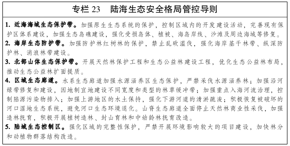 促进生态系统完整性、稳定性和服务功能的全面提升,加快形成“三带、多廊、多区”陆海生态安全战略格局,构筑以陆海生态控制区共同保育,生态廊道良性交互,山地、丘陵、平原、海岸、海域共同支撑的陆海生态安全体系。 努力构建近海海域天然生态保护带,保护全部近海海域生态环境,形成东起潮州柘林湾、西到湛江安铺港,以南澳岛群、遮浪岛群、万山岛群、川山岛群、湛江港岛群等连串岛链及饶平县中华白海豚、南澎列岛海洋生态、惠东港口海龟、珠江口中华白海豚、硇洲岛海洋资源、徐闻珊瑚礁等海洋自然保护区为主体,以典型珍稀动植物为重点的天然生态保护带,增强维持近海海域水动力稳定、生物多样性的生态保障能力。 构建以沿海岸线分布的防护林、湿地为主体的综合生态防护带,重点包括湛江红树林、茂名虎头山―晏镜岭防护林、阳江埠场防护林、深圳湾红树林、汕尾金町湾防护林、揭阳靖海湾防护林、汕头广澳湾防护林等,积极发挥缓冲陆海交互作用、抵御海洋自然灾害的生态保障功能。 以沿海经济带北部连绵山体为核心,形成沿云雾山、天露山、浮山岭、鹅凰嶂、皂幕山、白云山、罗浮山、九连山余脉分布的天然生态屏障,起到维护水源涵养能力、保护生物多样性、维持水土保持的生态保障作用。 以鉴江水系、漠阳江水系、珠江水系、榕江水系、韩江水系等五大流域为核心,构建水系生态廊道体系,强化保障区域水量供给、保护水生态健康、提高水环境容量作用。以天露山、古兜山、银瓶山、大南山等沿海山体为核心,维护山脊生态廊道,保障陆生动物迁徙通道,维护生物多样性。 以城市间重要生态空间为核心构建陆域生态控制区,重点包括鹤地水库、古兜山―五桂山―黄杨山、大岭山―银瓶山―凤凰山―羊台山、桑埔山等区域,发挥区域绿地的隔离和绿岛作用,促进城镇空间结构的优化。