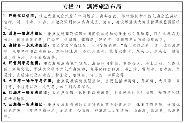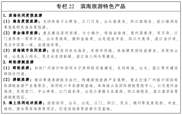 适应消费需求升级趋势,优化滨海旅游产品供给体系,依托我省滨海旅游公路有机串联滨海旅游景区,打造滨海旅游带,形成世界知名的美丽“珍珠链”。 加快广州南沙邮轮母港建设,支持深圳蛇口太子湾国际邮轮母港拓展始发航线和国际挂靠航线,提升邮轮港口综合服务水平,发展邮轮经济。支持各市依托现有港口基础条件,有序建设邮轮码头。支持深圳建设中国邮轮旅游发展试验区,发展自主邮轮全产业体系。制定广东游艇旅游发展指导意见,加快公共游艇码头和游船码头建设,创新游艇出入境管理模式,有序开发西江等内河航段和海岛之间的水上旅游线路,促进游艇旅游消费,构建游艇旅游产业集群。在有条件的滨海城市建设综合性海洋体育中心和体育旅游示范基地,发展海上休闲运动项目。 以海洋资源、岭南文化为依托,利用滨海优质海岸、海湾、海岛,加强滨海景观环境建设,促进观光、休闲、度假旅游市场全面发展,加快建设一批主题鲜明的滨海休闲度假区、海洋公园和滨海旅游产业区,逐步形成以滨海度假为主导,观光、休闲和度假相融合,专项旅游为补充的滨海旅游产品结构。加强旅游标准化建设,提升滨海旅游产品品质,支持珠海万山群岛、汕头南澳岛、惠州巽寮湾滨海旅游度假区等创建国家AAAAA级旅游景区或国家级旅游度假区。