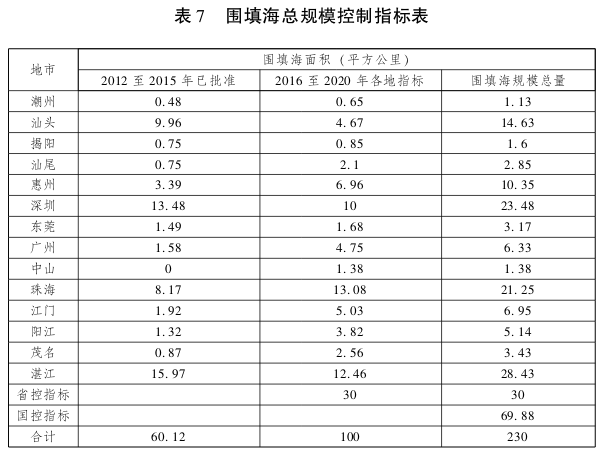 根据海洋功能区划、海域资源特点、生态环境现状和经济社会发展需求等实际,强化围填海计划管理,科学规范围填海造地活动,合理开发利用海域资源,整顿和规范围填海秩序。 根据海洋主体功能区划,将国家海洋局已批复的珠海高栏港经济区、南部滨海新城、江门新会区银湖湾区域、台山市广海湾临港产业区、汕头东部城市经济带、广州龙穴岛、阳江吉树港区、东莞虎门港长安港区、湛江东海岛临港工业区等9个地区作为重点围填海地区;将中山横门岛、南朗,深圳宝安沿岸、坝光,惠州大亚湾纯洲、范和港、东头,江门崖南,阳江丰头岛南,茂名博贺湾东部、西部和北部,湛江东海岛南部、吴川博茂、徐闻新寮、角尾湾和遂溪安铺港,汕尾白沙湖、陆丰甲西,揭阳惠来神泉,汕头广澳港、保税区、新津和新区二期、六合围、福隆围、南澳北、潮州柘林湾东部等作为适度围填海地区;将珠江口虎门、蕉门、洪奇门、横门、磨刀门、鸡啼门、虎跳门和崖门八大口门、深圳大鹏半岛南、深圳湾、江门镇海湾、茂名水东湾(内湾)、湛江通明海、汕头牛田洋、汕头港(海湾大桥以内)、汕尾品清湖、长沙湾、潮州柘林湾西部等作为禁止围填海地区。 实施围填海总量控制和年度供给计划的“双控”制度,防止超规模围填海。围填海计划指标重点支持21世纪海上丝绸之路建设重大项目、国家和省重大基础设施、民生工程、沿海新型城镇化建设项目,以及已批准的区域建设用海规划内建设项目,优先保障海洋产业园区项目建设,支持美丽海湾建设项目需求。实施围填海指标差别化配置制度,优先满足用地紧张的珠三角沿海片区国际化、高端化发展围填海需求;对于土地资源相对丰富的粤东粤西沿海片区,控制围填海指标配给,重点支持新城新区、高端产业和港口建设等具有迫切需求且符合规划的项目。严格限制高耗能、高污染、高耗水、资源消耗型产业围填海及单纯以获取土地为目的的围填海项目,对存在批而不填、围而不填、填而不建的市(县)地区暂停受理围填海申请。2012至2020年,我省围填海面积不高于230平方公里。