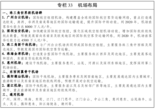 对接全省“5+4”骨干机场总体布局,加快沿海地区民用运输机场建设,积极发展通用航空,构建以珠三角机场群为核心,覆盖东西两翼的沿海民用机场发展格局,打造全球航空运输网络重要枢纽。 加快以广州、深圳为核心的珠三角世界级机场群建设,新建珠三角新干线机场,推进广州白云机场、深圳宝安机场、珠海金湾机场、惠州平潭机场等机场改扩建工程,规划建设广州增城机场,全力支持广州白云机场建成具有较大影响力的国际航空枢纽机场,加快深圳机场国际航空枢纽建设。高标准推进湛江机场迁建,加快实施揭阳潮汕机场扩建,提升粤东粤西机场枢纽的服务能力。稳步发展通用航空,在广州、珠海、汕头、东莞、汕尾、茂名、江门、潮州等市新建一批通用机场,探索发展高端中心交通服务。发挥机场区位优势,积极推进广州、深圳、珠海、揭阳等机场临空产业园区建设。加强区域内机场合作,避免恶性竞争,形成空中交通运输的整体优势。力争到2020年沿海经济带机场旅客吞吐能力达14亿人次,货邮吞吐能力达610万吨。 加快构建以国际航线、国内干线、区域支线相互支撑,以广州、深圳国际航空枢纽机场为中心的轮辐式航线网络体系。支持广州白云机场构建覆盖全球的国际航空客货运输网络,增强国际中转服务竞争力;拓展深圳宝安机场国际航线网络,提升揭阳潮汕机场、珠海金湾机场等机场国际航运功能。积极推进广州、深圳枢纽机场国内干线快线化服务系统建设,形成与京津冀、长三角等重点区域间的便捷航空运输通道;提升其他机场国内航线网络通达能力。 大力发展空铁联运,积极推进将高速铁路、城际(市)轨道交通、高速公路等引入机场,加快珠三角城际铁路广佛环线、新塘经白云机场至广州北城际铁路、白云机场第二高速公路、珠海市区至珠海机场城际铁路、吴川至湛江机场高速公路等机场对外快速通道建设,做好穗莞深城际铁路和深茂铁路与深圳机场、梅汕铁路与潮汕机场衔接。结合广州白云、深圳宝安、珠海金湾、揭阳潮汕等机场改扩建工程,优化完善内部设施布局,加强机场交通中心换乘功能,有效提升内部交通运行效率。依托轨道交通、高速公路发展城市候机楼,前移机场陆侧功能,方便旅客出行,降低航站区运行压力。