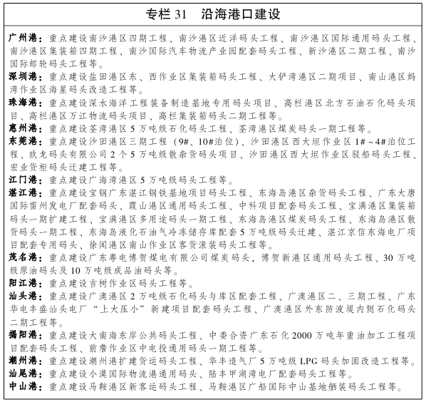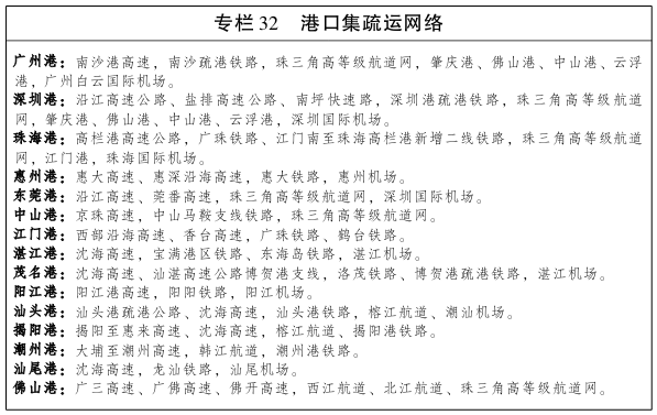 二、打造衔接有序、协同联动的航运集疏网络 以疏港铁路和公路为重点,统筹港口、铁路、公路、内河港口等联动发展。优化港口公路运输网络,重点强化重要港口与高速公路网络的对接,推进“最后一公里”的公路网络建设,提升港口的快速集疏能力。推进港口疏港铁路的建设进度,加快广州港南沙港区、茂名港博贺新港区、湛江港东海岛港区等疏港铁路建设,有序推进汕头港、潮州港、揭阳港、汕尾港、中山港、江门港等疏港铁路建设。到2020年底,新增疏港铁路运营里程170公里。发展以港口为枢纽的物流体系,开展冷链、汽车、化工等专业物流服务。强化港口物流信息化体系建设,完善大通关协作机制,提升航运集疏效率。强化珠三角航运聚集区功能,加强粤东、粤西港口与临港物流园的联动发展。