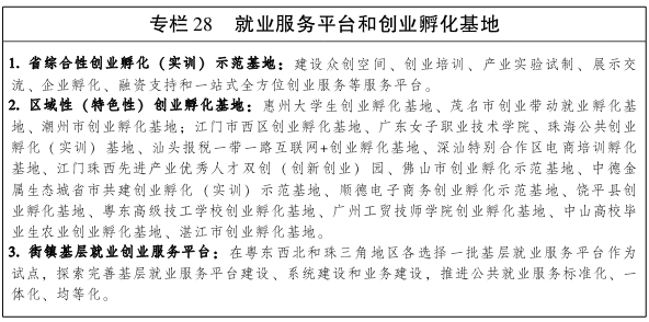 充分发挥沿海经济带产业集聚和创新资源集聚优势,引进海外高端人才、培养高层次拔尖创新人才,建设成为海洋高端人才集聚地和高素质人力资源密集区。布局建设一批创业基地、留学回国人员创业园、大学生创业园等,重点建设省综合性创业孵化(实训)示范基地,支持深汕特别合作区电商培训孵化基地、珠海公共创业孵化(实训)基地、惠州大学生创业孵化基地、茂名市创业带动就业孵化基地、潮州市创业孵化基地、湛江市创业孵化基地等一批区域性(特色性)创业孵化基地建设,鼓励发展众创、众包、众筹、众扶新模式。健全覆盖城乡劳动者的公共就业服务体系,打造“互联网+”就业创业服务平台和街镇基层就业创业服务平台,推进公共就业服务标准化、一体化、均等化。加快技工教育示范基地、公共职业技能培训基地建设,提高劳务输入组织化程度和劳动力技能水平,加快培育高技能实用人才队伍。加强农村劳动力转移,重点吸纳当地劳动力就业。