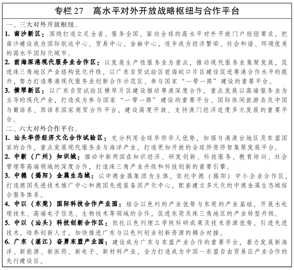 三、扩大科技创新对外开放 积极吸引和对接全球创新资源,促进国内外创新资源与沿海地区创新创业环境有机融合,打造具有国际竞争力的科技创新高地。加强与港澳科技创新合作,推进“广州―深圳―香港”粤港创新走廊、深港创新圈建设,推动粤港澳合作共建国际化创新平台、联合实验室和研究中心,实施粤港澳科技创新合作发展计划和粤港联合创新资助计划,联合港澳设立产学研创新联盟,促进粤港澳创新要素有序自由流动。实施国际科技合作提升计划,健全科技创新与知识产权交流合作机制,依托产业优势和重大科技基础设施,加强与美国、欧盟、以色列等发达国家和地区的合作,大力吸引国际知名科研机构、世界500强等跨国公司、国际科技组织在广东设立研发中心或区域研发机构,推动建设国际大师研究基地和国家级国际科技合作基地。加快建设中新(广州)知识城、落马洲河套地区港深创新及科技园、中以(东莞)国际科技合作产业园、中德(中山)生物医药产业园、中瑞(欧)工业园、中以(汕头)科技创新合作区、广东(湛江)奋勇东盟产业园、中德(揭阳)金属生态城、中德(茂名)精细化工园等国际创新合作平台,加快广州大学―瑞典林雪平大学可持续发展研究中心、中科院广州生物医药与健康研究院―新西兰奥克兰大学生物医药与健康国际联合研究中心、中以(惠州)联合科技创新中心、中乌巴顿焊接研究院等国际联合研究中心和深圳诺贝尔奖科学家实验室等建设。 深入推进科技兴海,围绕海洋工程装备制造、海洋生物医药、海洋电子信息、海水淡化和综合利用等海洋新兴产业,突破一批共性技术和关键技术,加强绿色环保船舶、高技术船舶、海洋工程装备设计建造的基础共性技术、核心关键技术、前瞻先导性技术研发,加强船舶与海洋工程装备配套系统和设备等研制。重点瞄准可燃冰在珠三角地区的开发利用,大力推进省部合作共建深海科技创新平台,加快建设深海科技创新中心、可燃冰国际合作研发中心、可燃冰勘查开发技术孵化中心,建设可燃冰国家工程实验室。加强产学研基地、海洋科技创新平台、跨区域海洋创新创业等涉海自主研发平台建设。支持湛江建设国家海洋经济创新发展示范城市。加快广东海洋与水产高科技园建设。支持海洋科学广东省实验室建设,积极争取筹建海洋科学与工程国家实验室,争取国家海洋局在广东设立海洋研究所,支持深圳海洋工程技术研究院建设。加快建设广州、湛江国家海洋高技术产业基地。推进广州南沙新区科技兴海产业示范基地、珠海经济技术开发区海洋装备制造集聚区和深汕特别合作区海洋产业集聚区等现代海洋产业集聚区建设。推动海洋科技成果转化,加快构建以市场为导向、金融为纽带、产学研相结合的海洋产业创新联盟。
