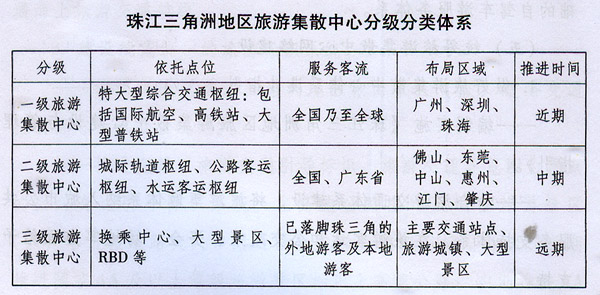 ——根据国家旅游局颁布的《城市旅游集散中心等级划分与评定》,逐步推进珠三角多级旅游集散服务体系建设。近期建设广州、深圳、珠海一级综合性旅游集散中心,推进广州南站、深圳北站、珠海城区建设一级旅游集散中心,中期完善佛山、东莞、中山、惠州、江门和肇庆二级旅游集散中心,远期在主要交通站点、旅游城镇和大型景区等建设三级旅游集散中心。到2020年底,珠三角形成以公共交通为基础、旅游集散中心为节点、通达各旅游景区的三级旅游集散体系。详见下表。