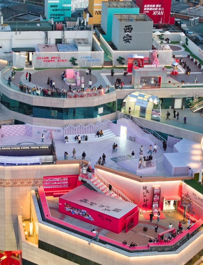 2025年3月19日,游客在西安开元商城观景平台上拍照游玩(无人机照片)。新华社记者 邵瑞 摄