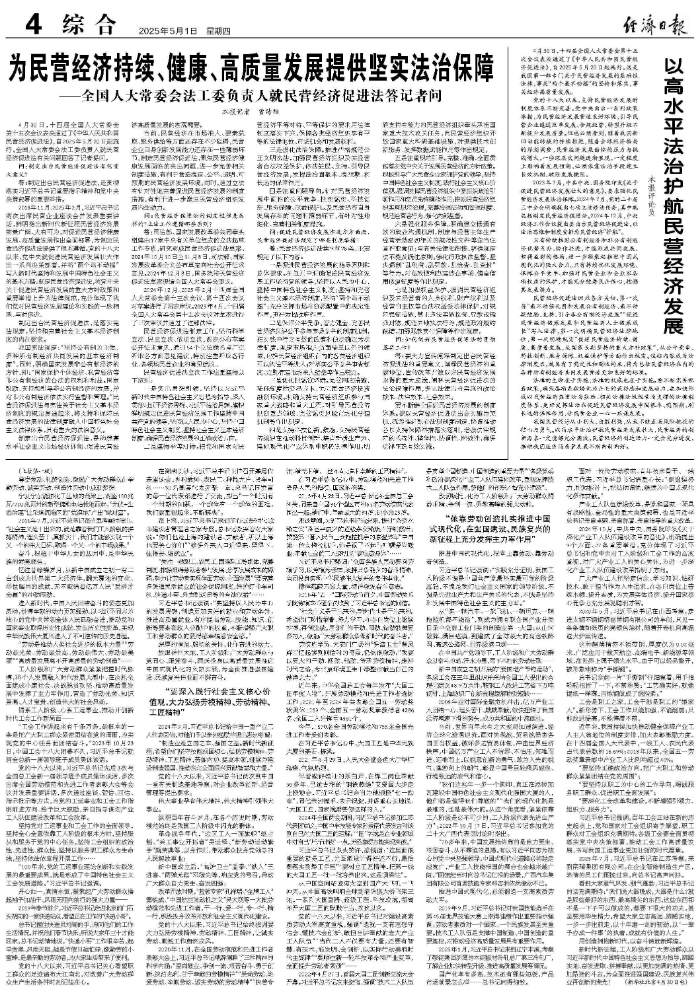 4月30日,十四届全国人大常委会第十五次会议表决通过了《中华人民共和国民营经济促进法》,自2025年5月20日起施行。这是我国第一部专门关于民营经济发展的基础性法律,事关“两个毫不动摇”的坚持和落实,事关经济高质量发展。