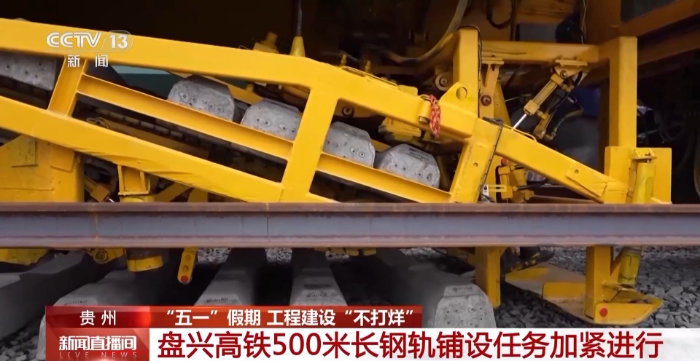 在贵州省盘州市境内的盘兴高铁建设工地上,机器轰鸣声阵阵,工人们正操作着我国自主研制的铺轨机,加紧进行500米长钢轨铺设任务。据了解,盘兴铁路建成后,贵阳至兴义2小时左右可达,彻底改变两地之间的交通格局。