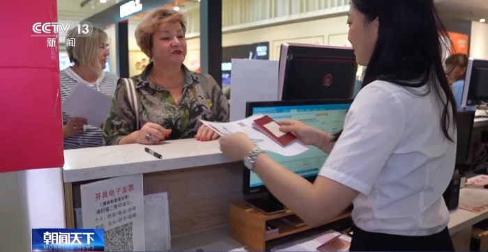 这家商场刚刚启动了离境退税业务,外国游客购物后可以到商场内的“即买即退”集中退付点办理退税手续,现场就能拿到退税现金。