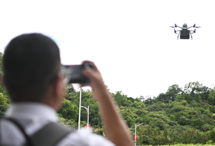 2025年6月26日,参观者在联合飞机集团深圳基地拍摄飞行中的物流无人机。新华社记者 邓华 摄
