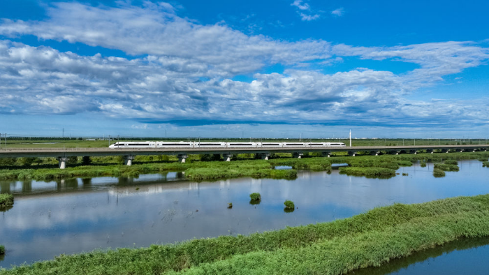 8月17日,一列动车组列车正行驶在哈齐高铁线上(无人机照片)。新华社发(原勇摄)